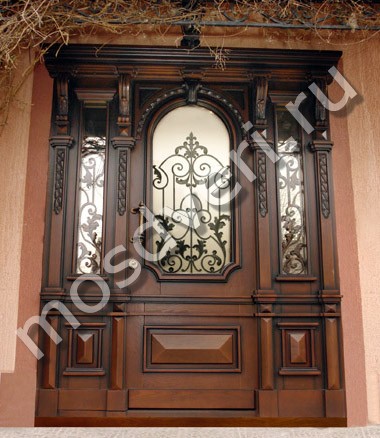 Парадная дверь в дом из массив дуба со стеклопакетом, ковкой и резьбой по дереву